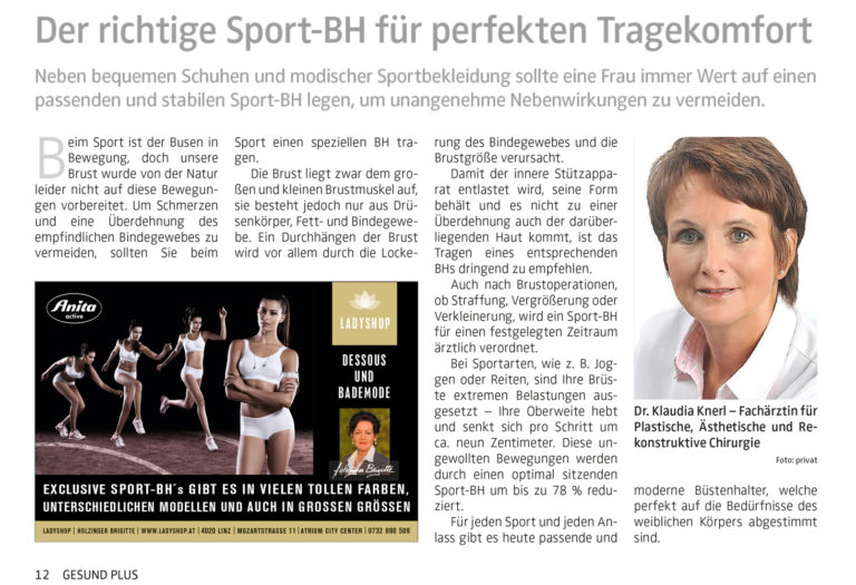 Neben bequemen Schuhen und modischer Sportbekleidung sollte eine Frau immer Wert auf einen passenden und stabilen Sport-BH legen, um unangenehme Nebenwirkungen zu vermeiden, rät Frau Dr. Klaudia Knerl – Fachärztin für Plastische, Ästhetische und Rekonstruktive Chirurgie.